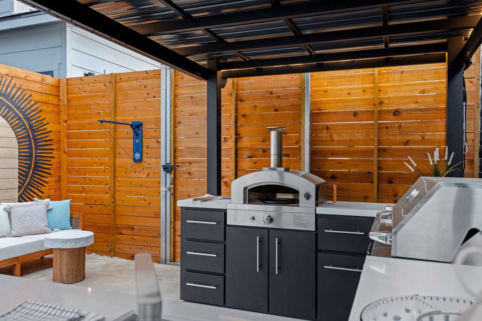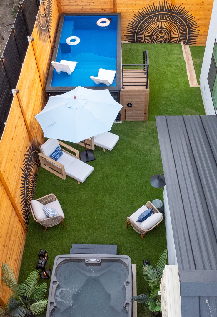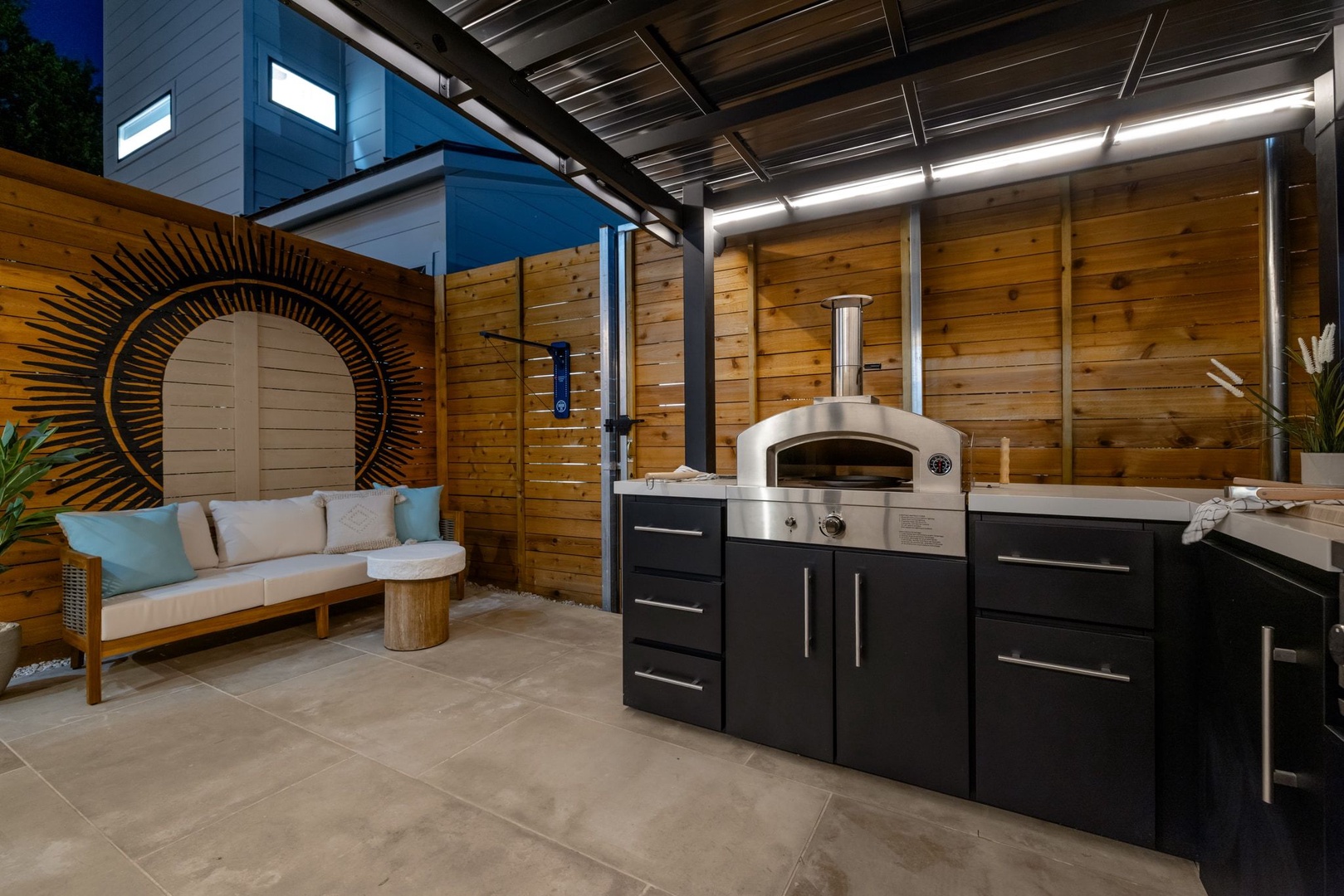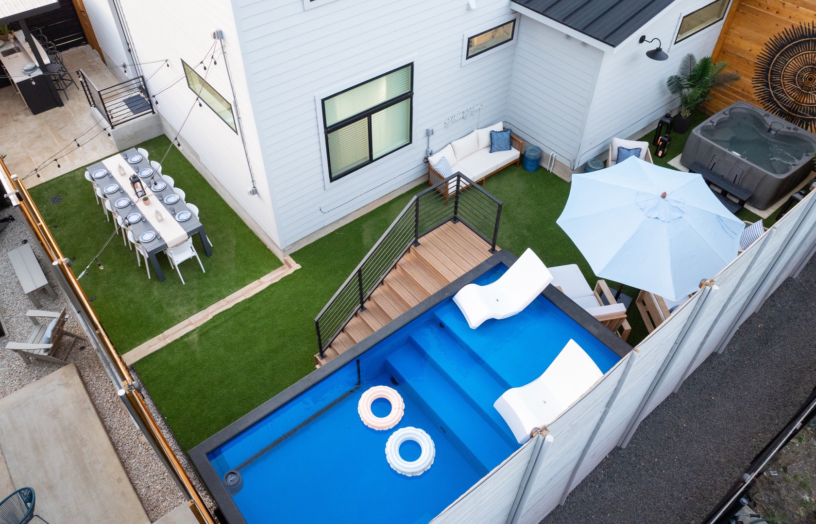 ? Out of this world amenities: One of a kind container pool. 6 person jacuzzi / hottub. Outdoor kitchen which includes grill, mini fridge, sink, pizza oven, tons of counter space and bar seating. Outdoor dining and several sitting/lounging areas with tons of awesome night time mood lighting.
