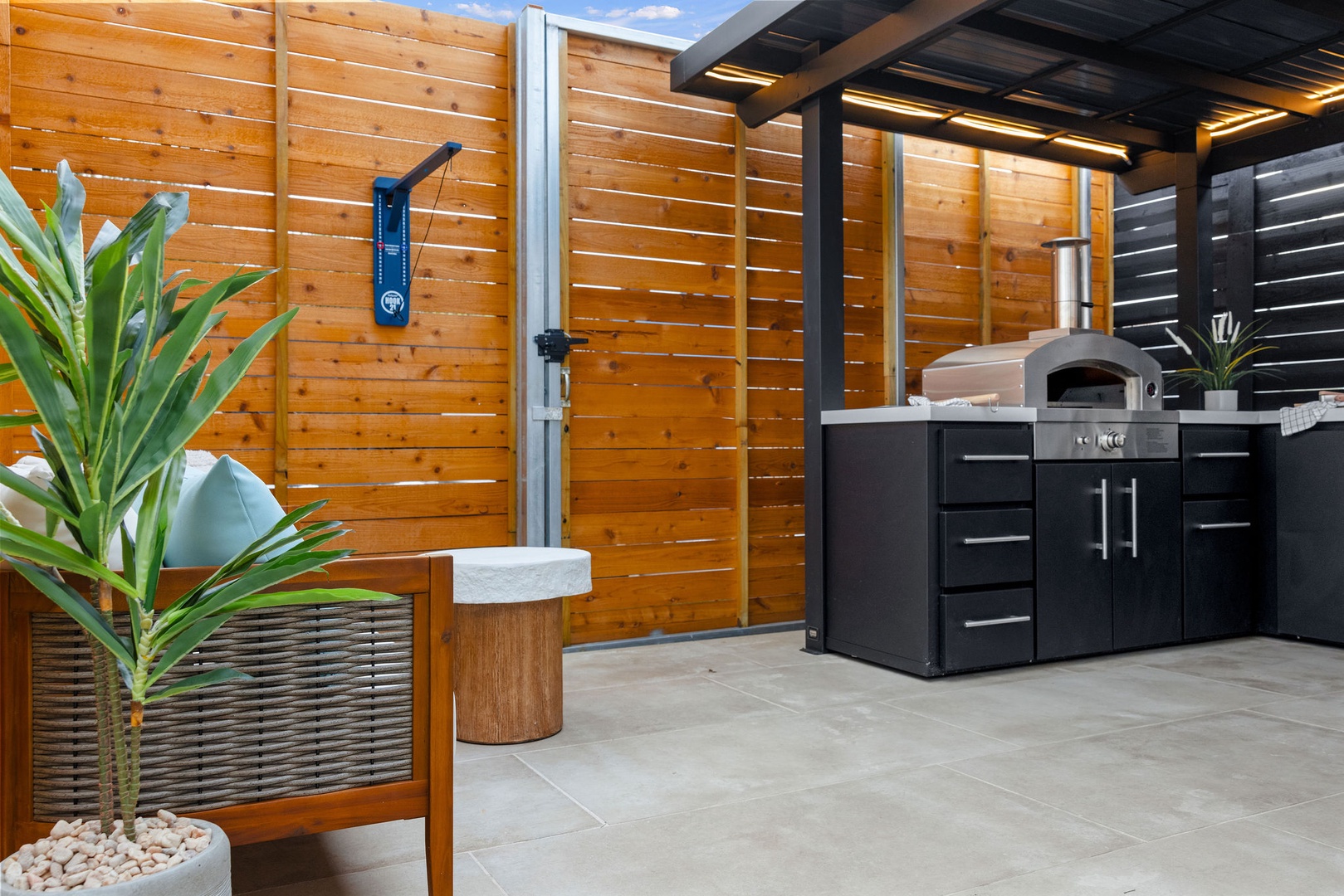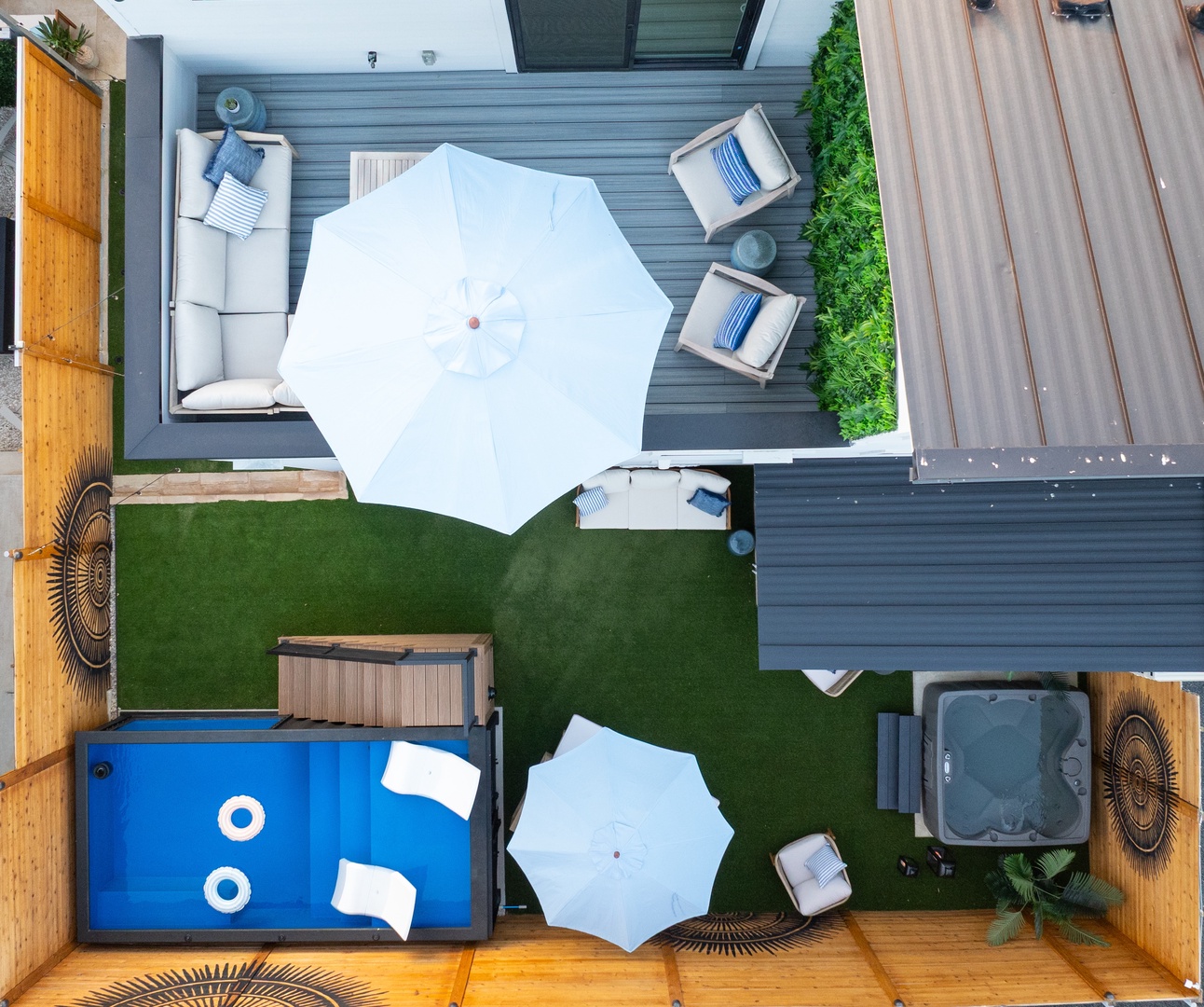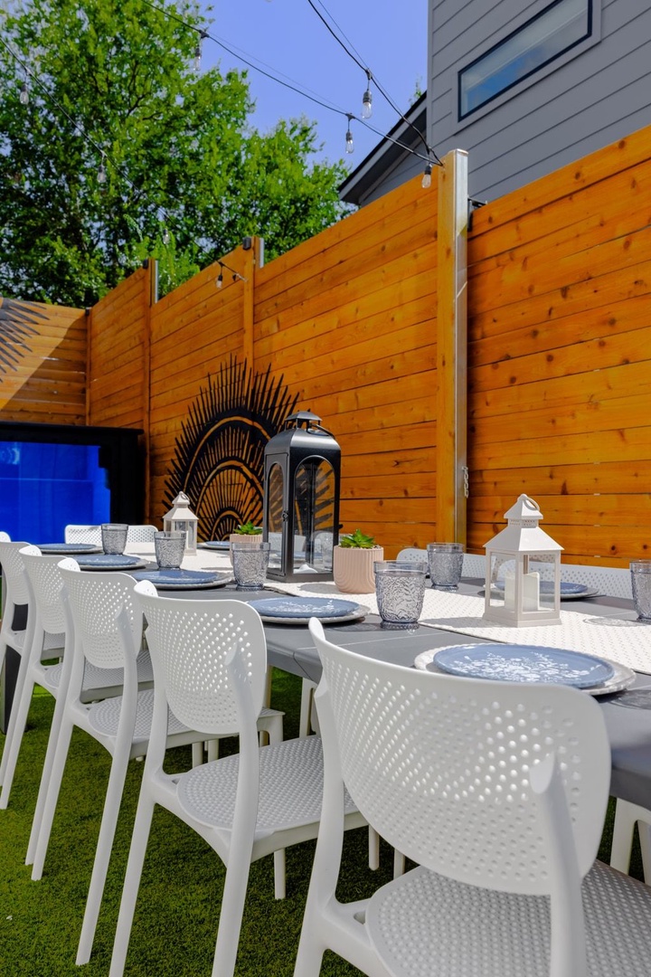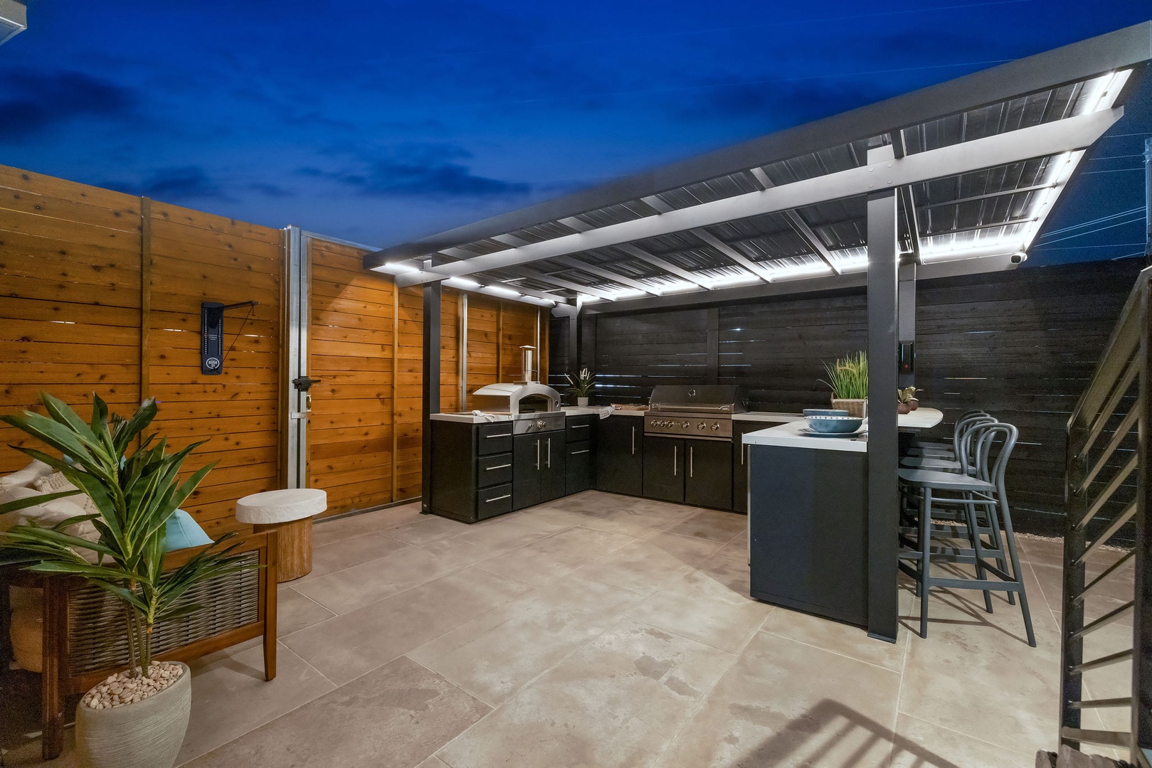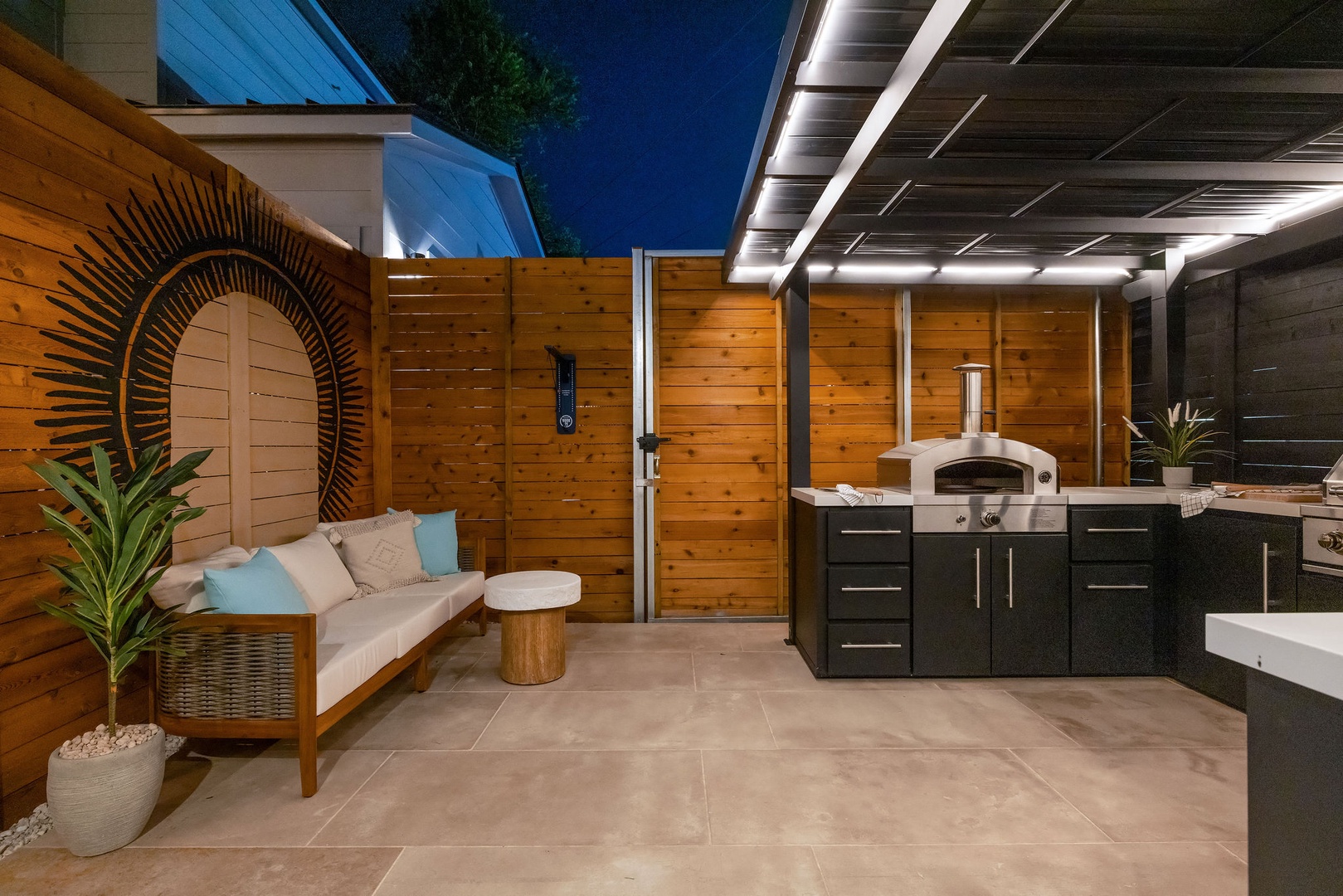 ? Out of this world amenities: One of a kind container pool. 6 person jacuzzi / hottub. Outdoor kitchen which includes grill, mini fridge, sink, pizza oven, tons of counter space and bar seating. Outdoor dining and several sitting/lounging areas with tons of awesome night time mood lighting.