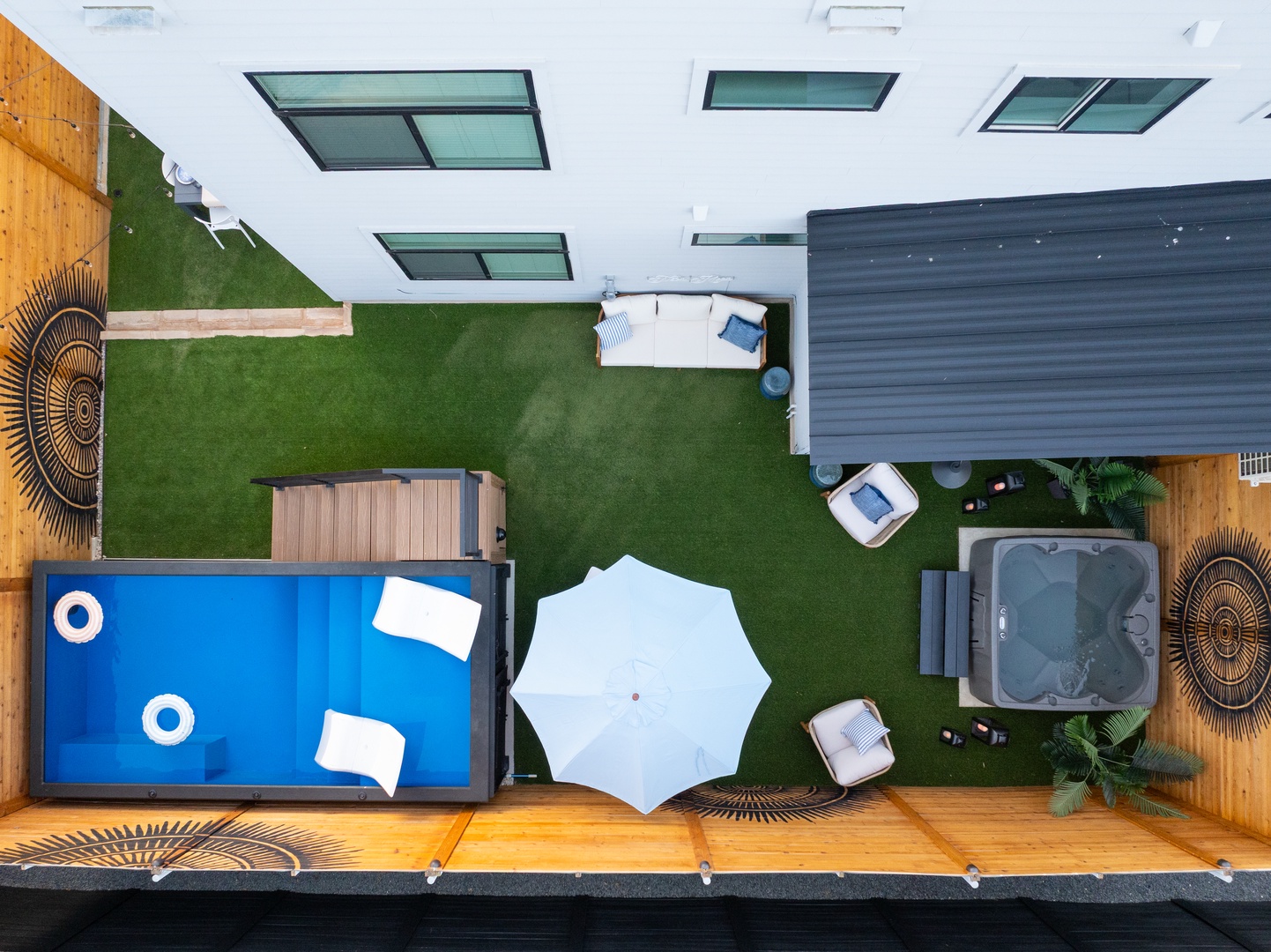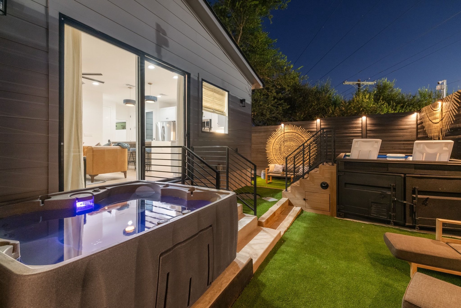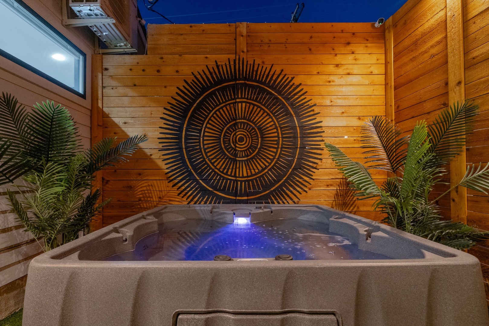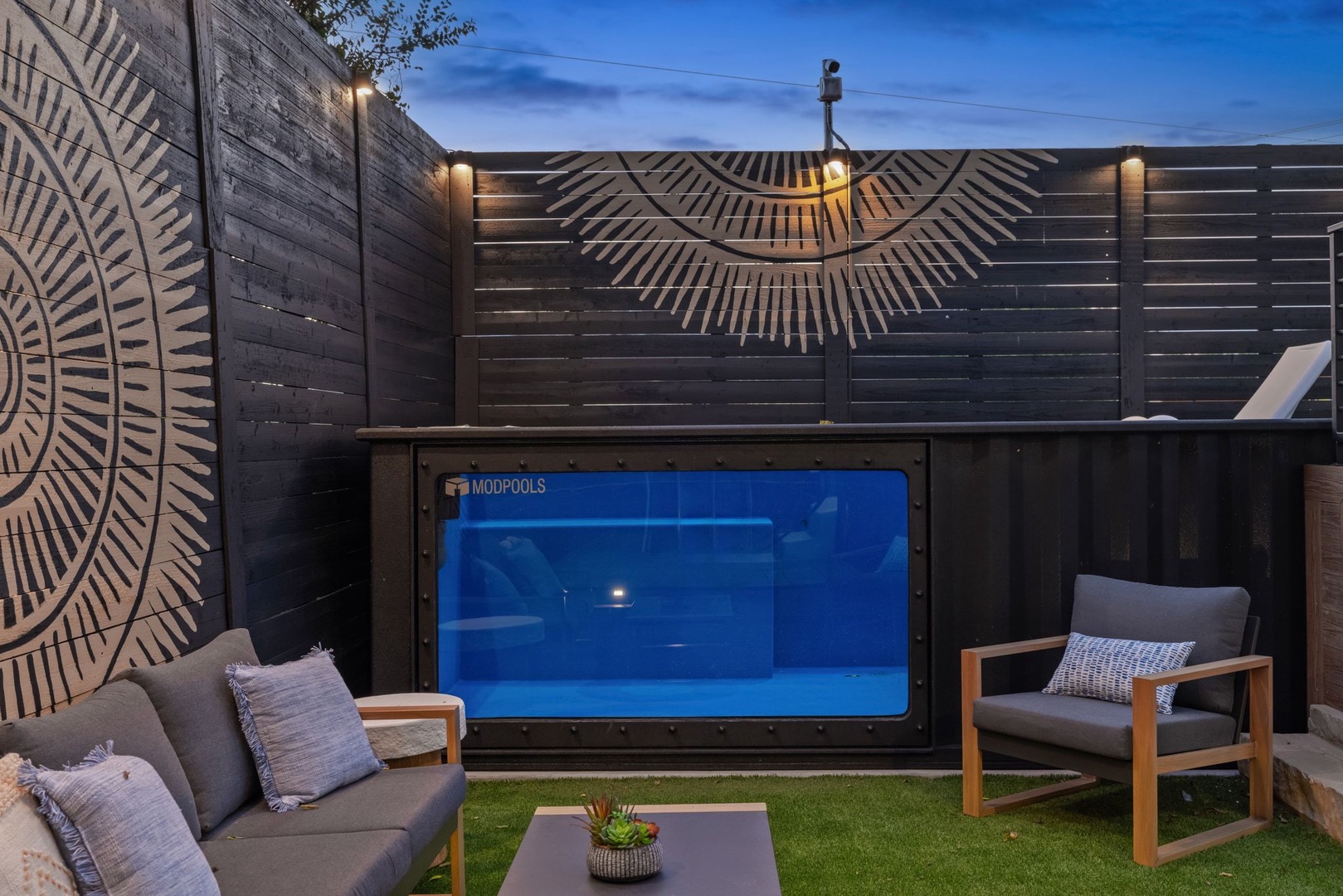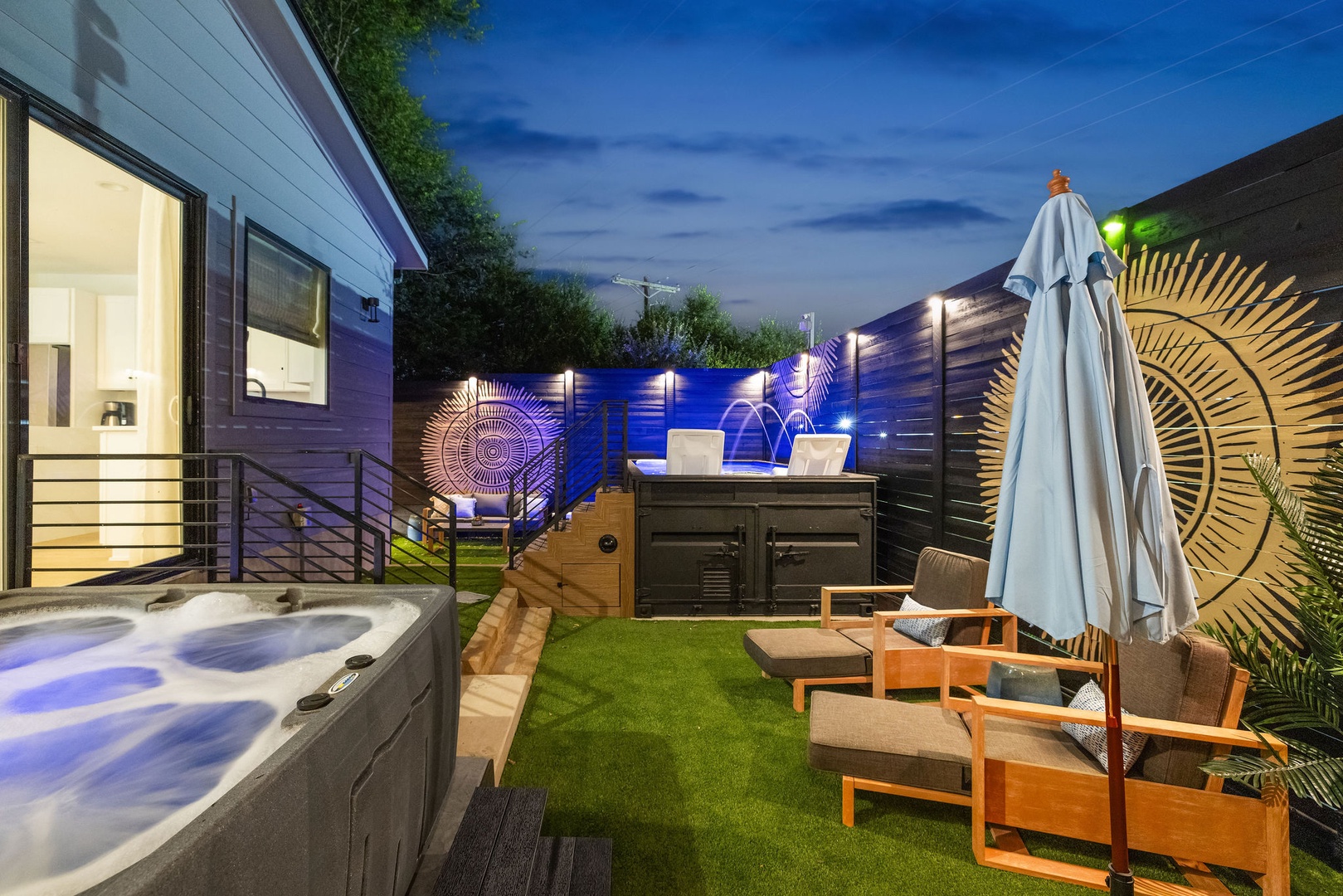 ? Out of this world amenities: One of a kind container pool. Two 6 person jacuzzis / hottubs. 2x Outdoor kitchens including 2x gas grills, 2x mini fridges, sink, gas pizza oven, tons of counter / prep space and bar seating. Outdoor dining and several sitting/lounging areas with tons of awesome night time mood lighting.