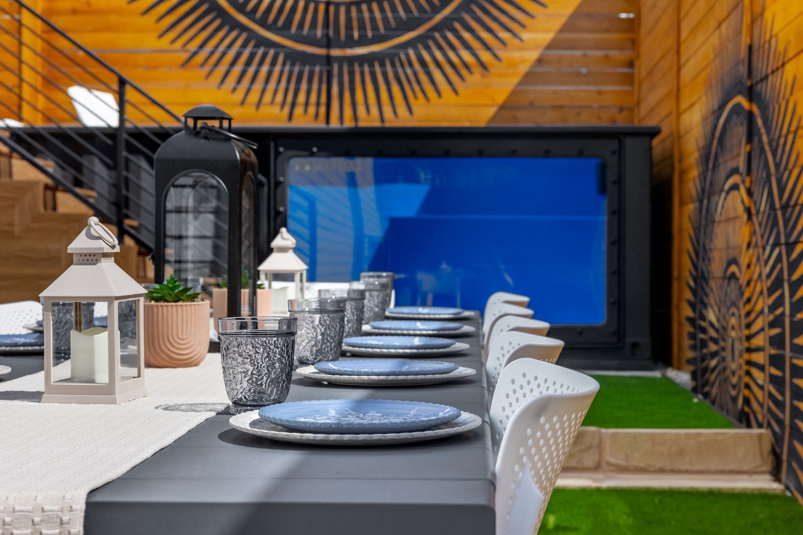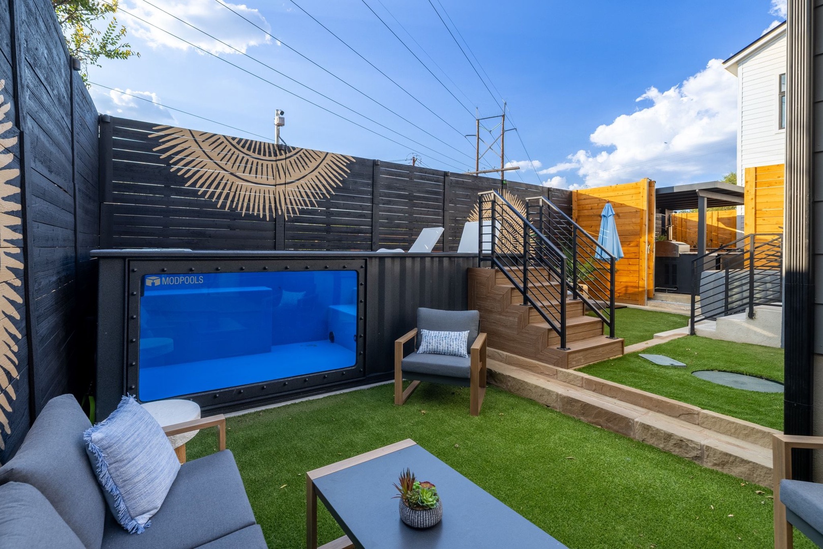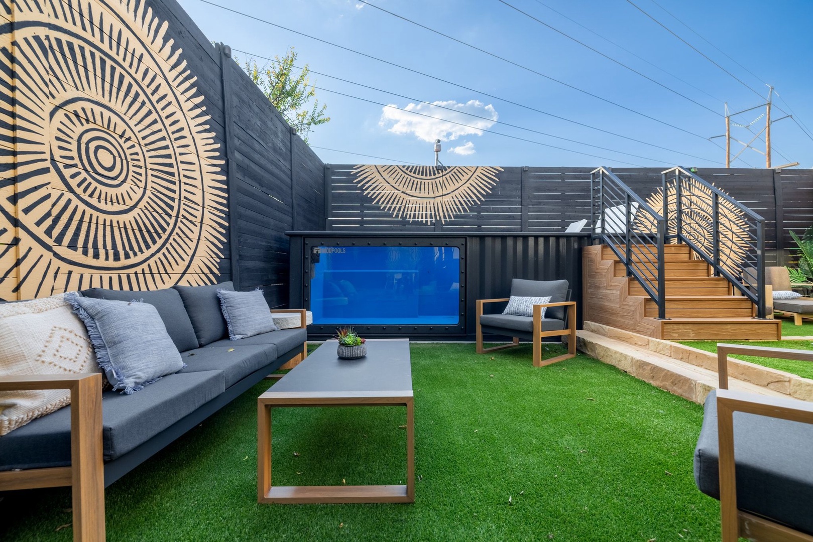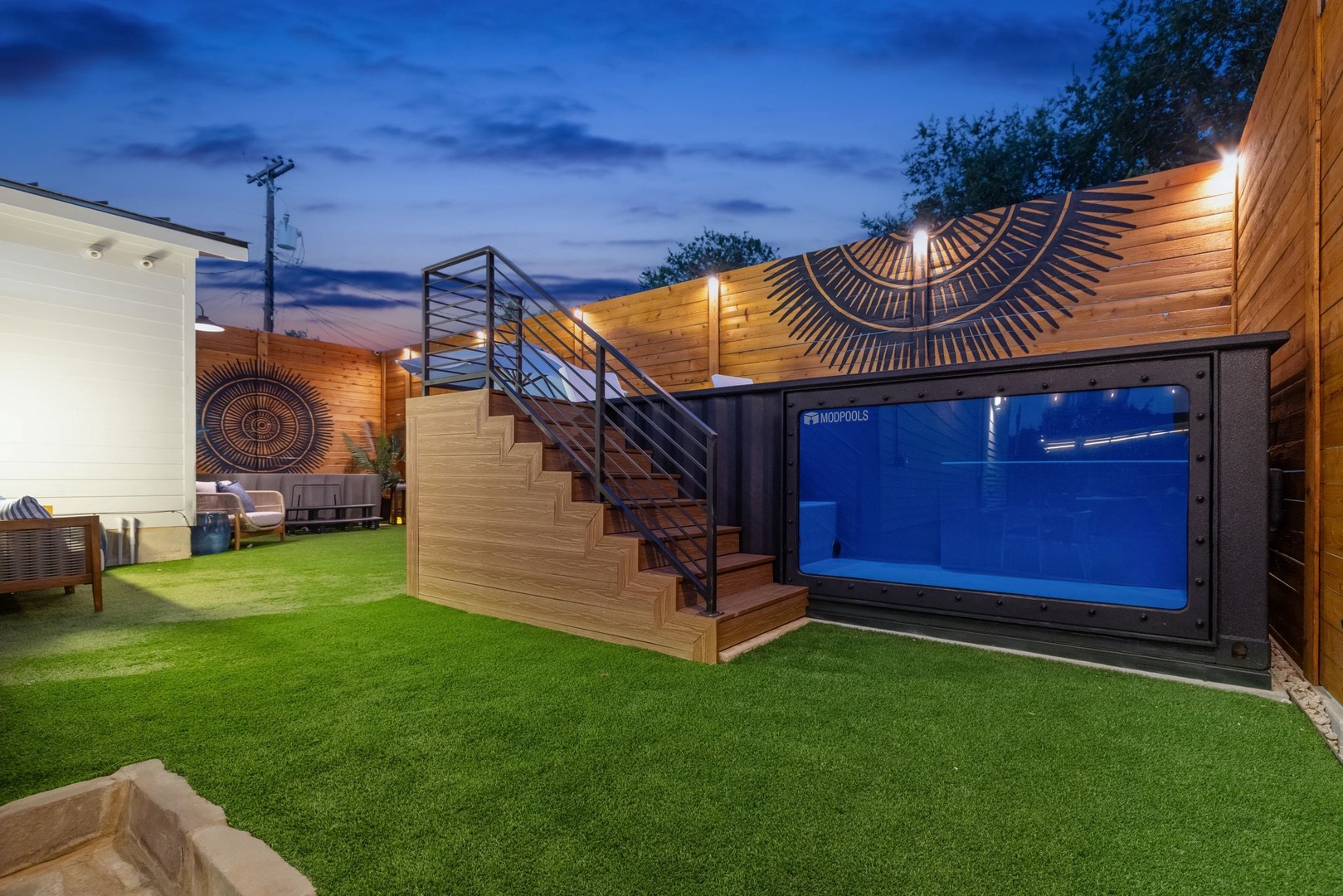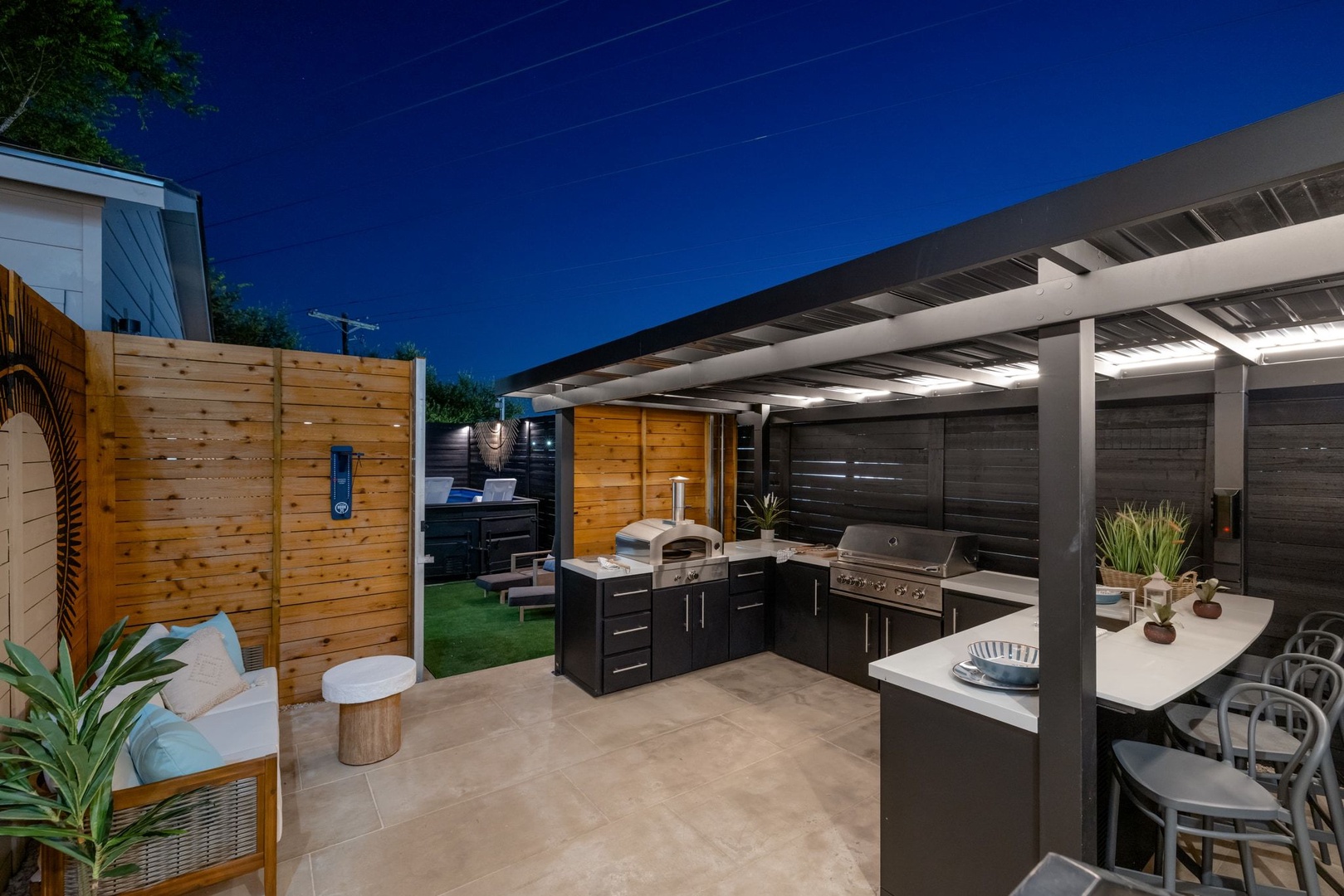 ? Out of this world amenities: One of a kind container pool. Two 6 person jacuzzis / hottubs. 2x Outdoor kitchens including 2x gas grills, 2x mini fridges, sink, gas pizza oven, tons of counter / prep space and bar seating. Outdoor dining and several sitting/lounging areas with tons of awesome night time mood lighting.
