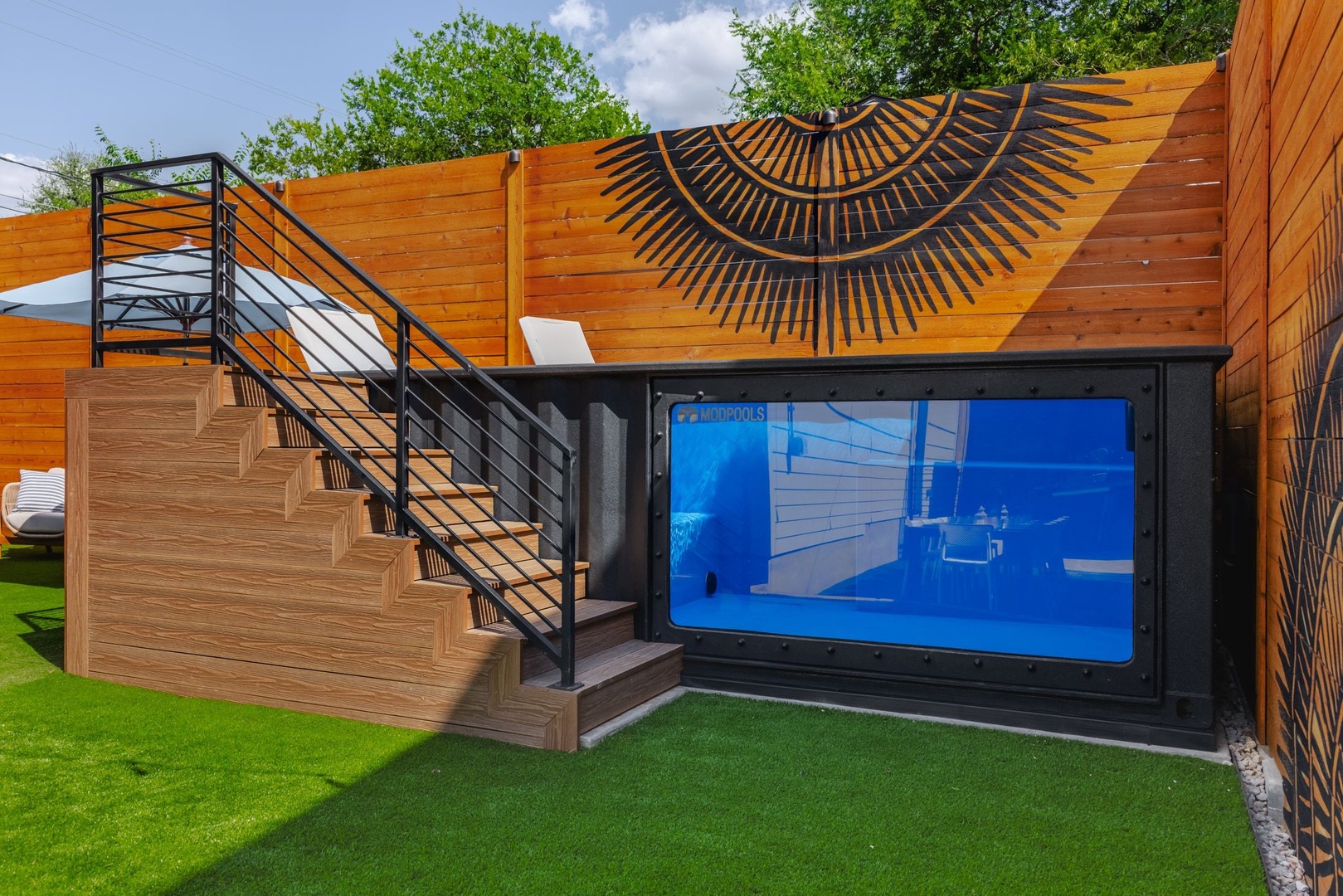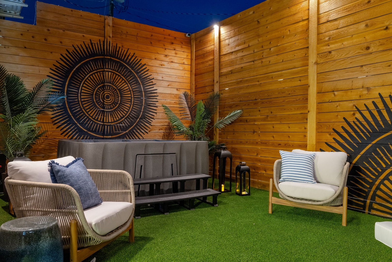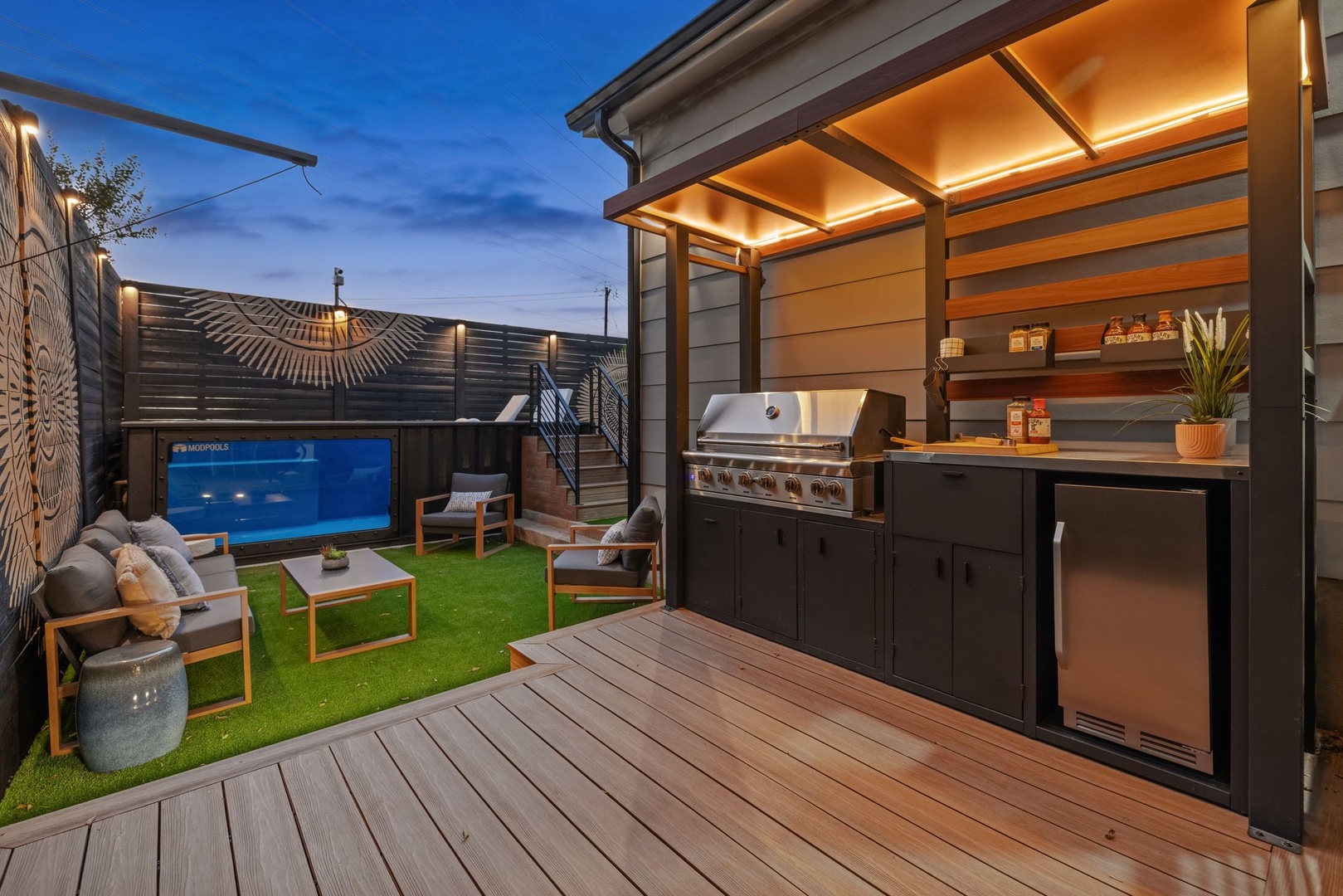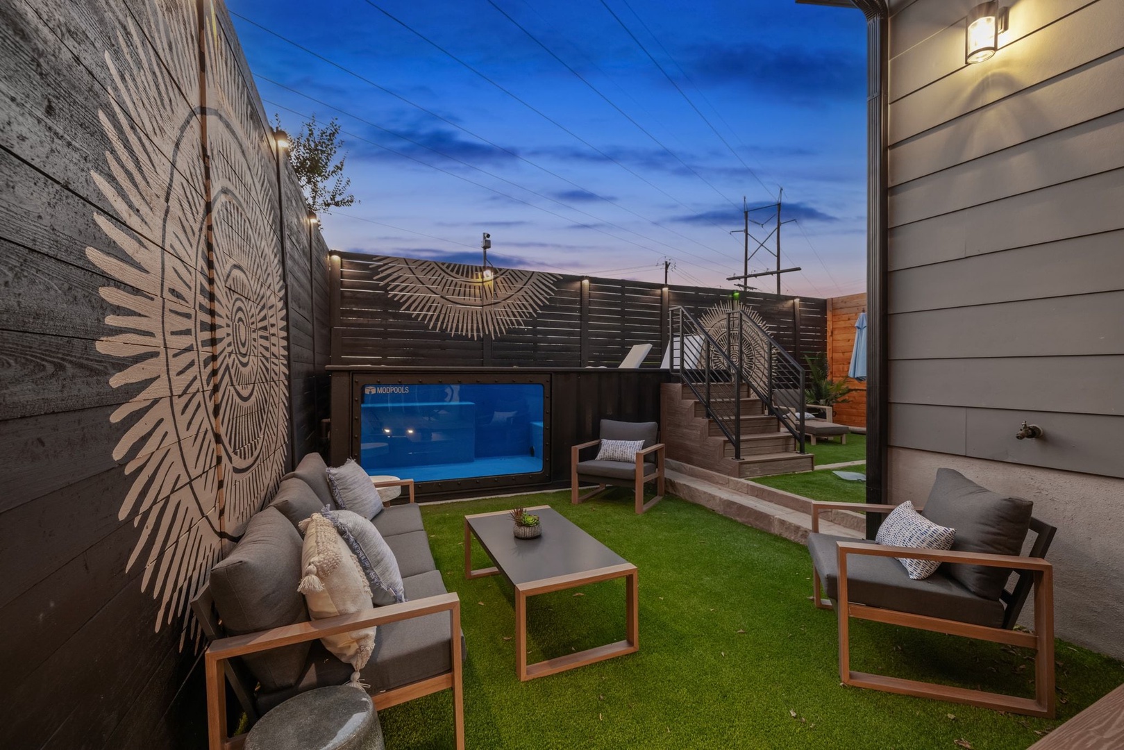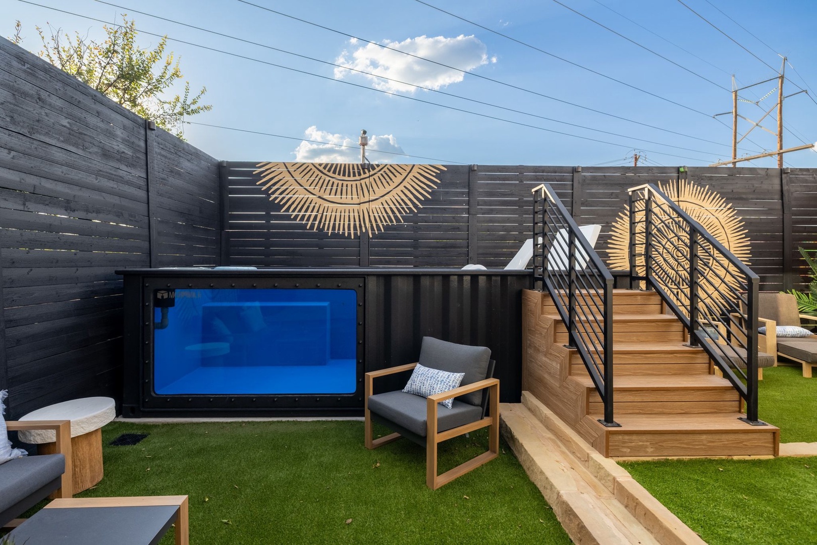 ? Out of this world amenities: One of a kind container pool. Two 6 person jacuzzis / hottubs. 2x Outdoor kitchens including 2x gas grills, 2x mini fridges, sink, gas pizza oven, tons of counter / prep space and bar seating. Outdoor dining and several sitting/lounging areas with tons of awesome night time mood lighting.