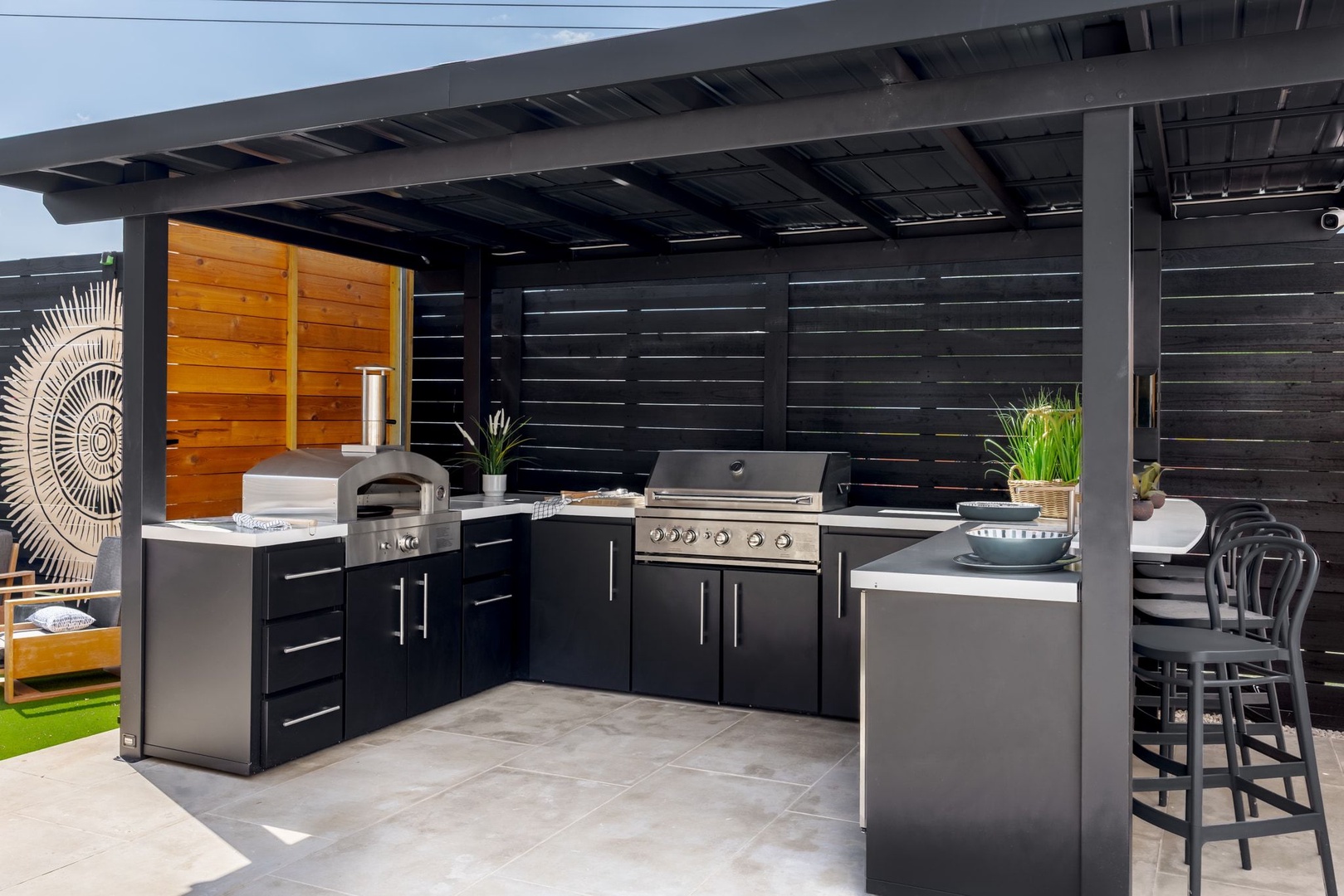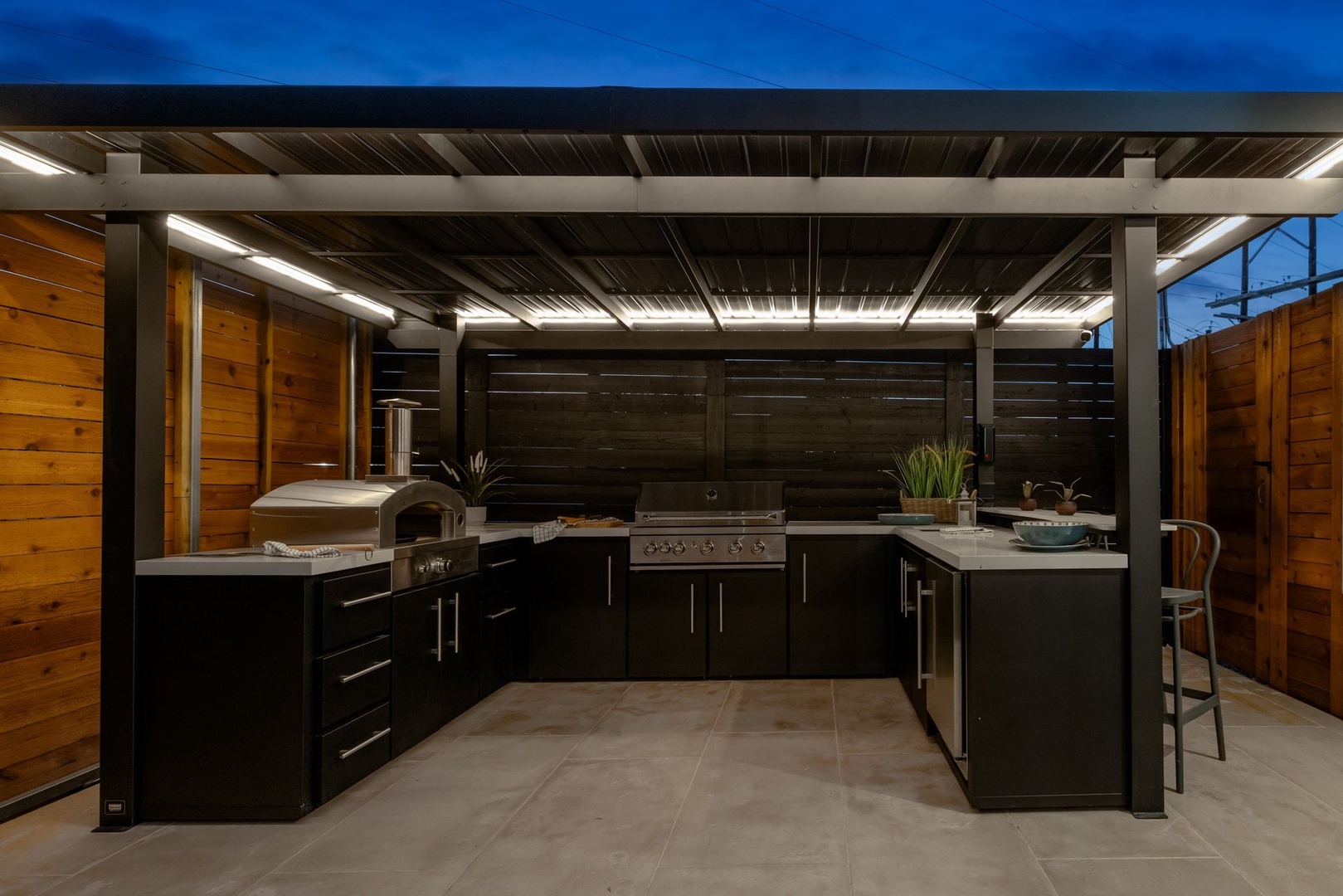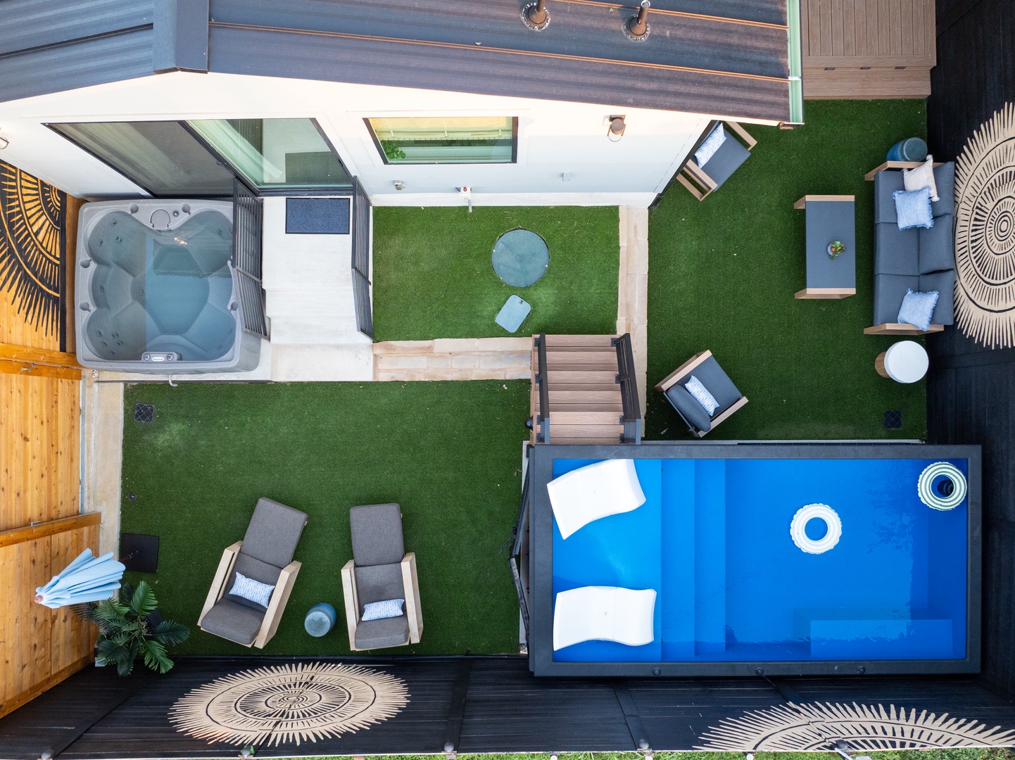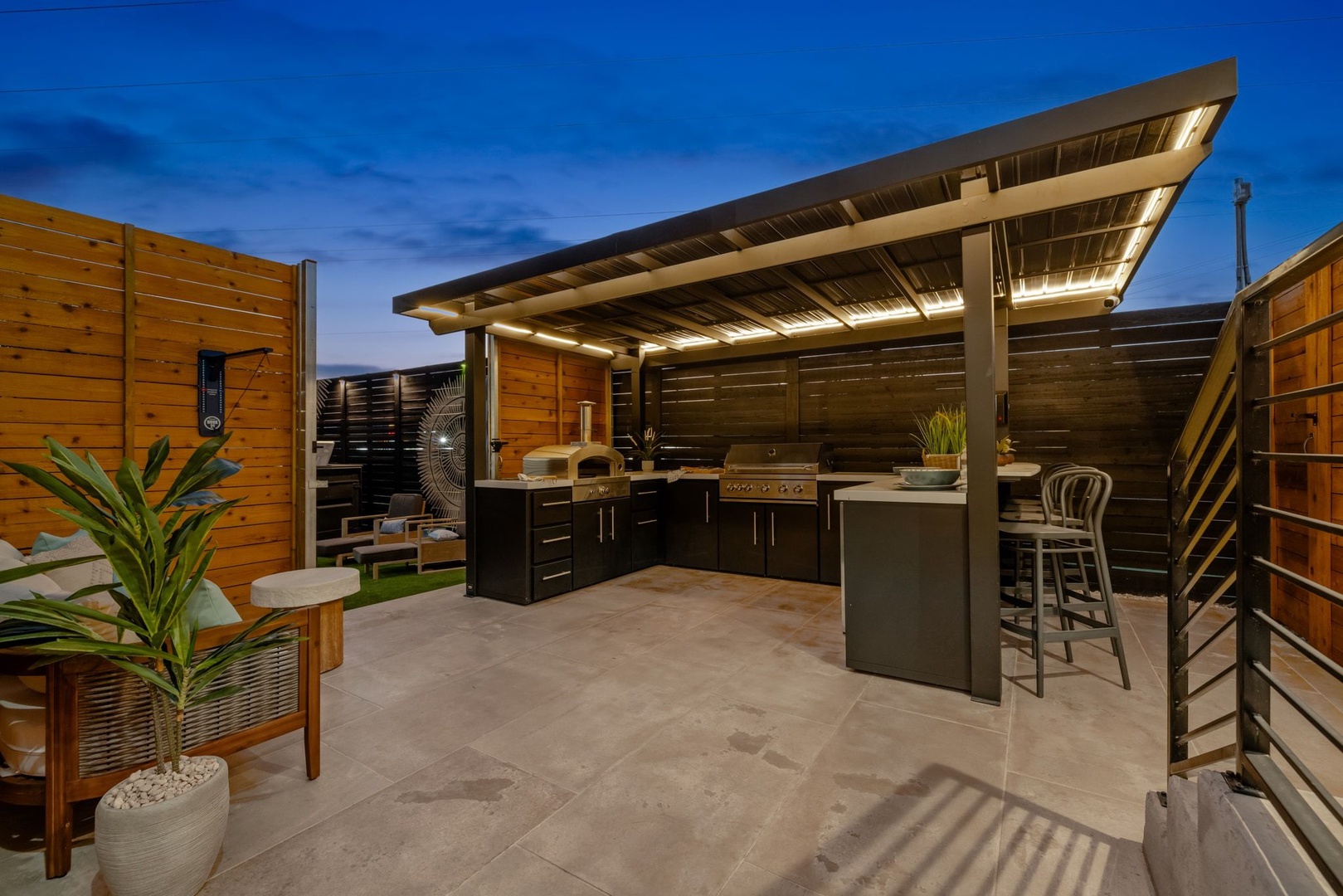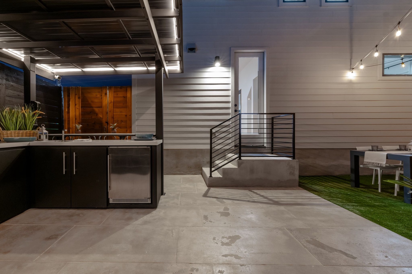 ? Out of this world amenities: One of a kind container pool. Two 6 person jacuzzis / hottubs. 2x Outdoor kitchens including 2x gas grills, 2x mini fridges, sink, gas pizza oven, tons of counter / prep space and bar seating. Outdoor dining and several sitting/lounging areas with tons of awesome night time mood lighting.