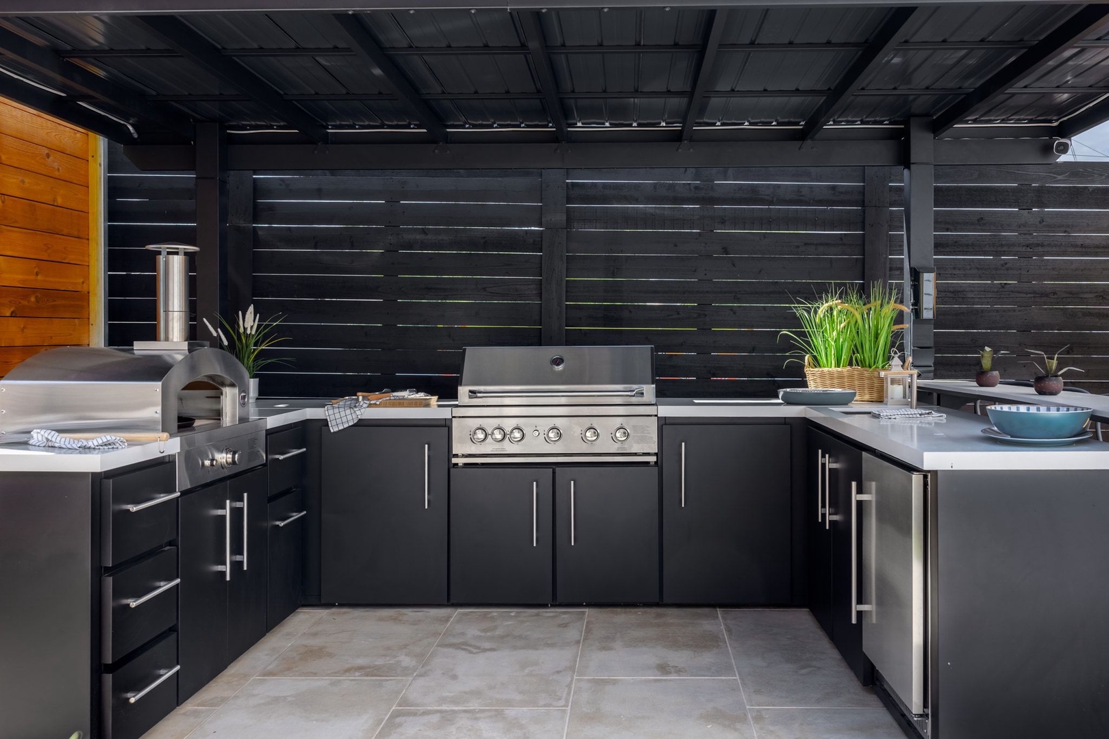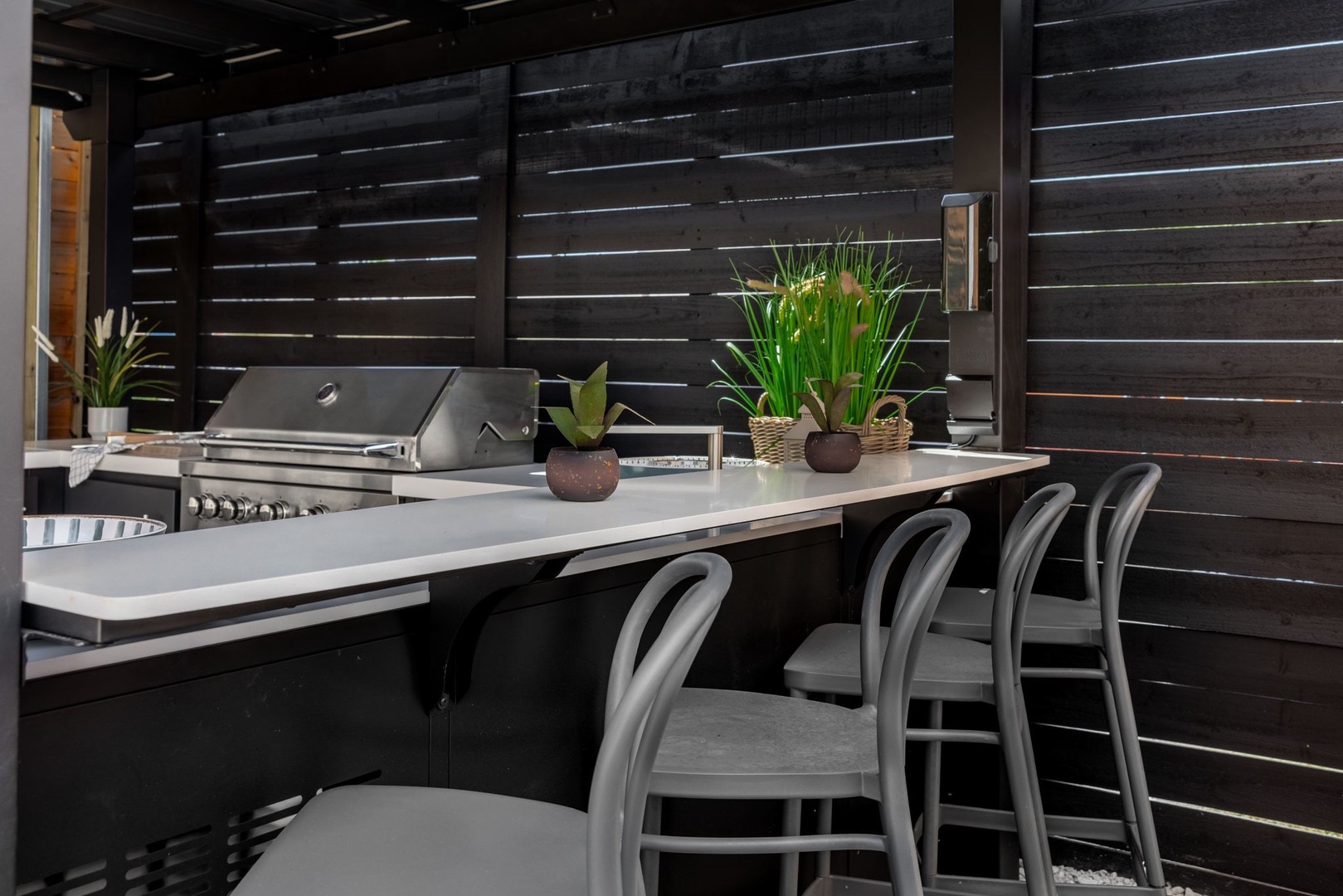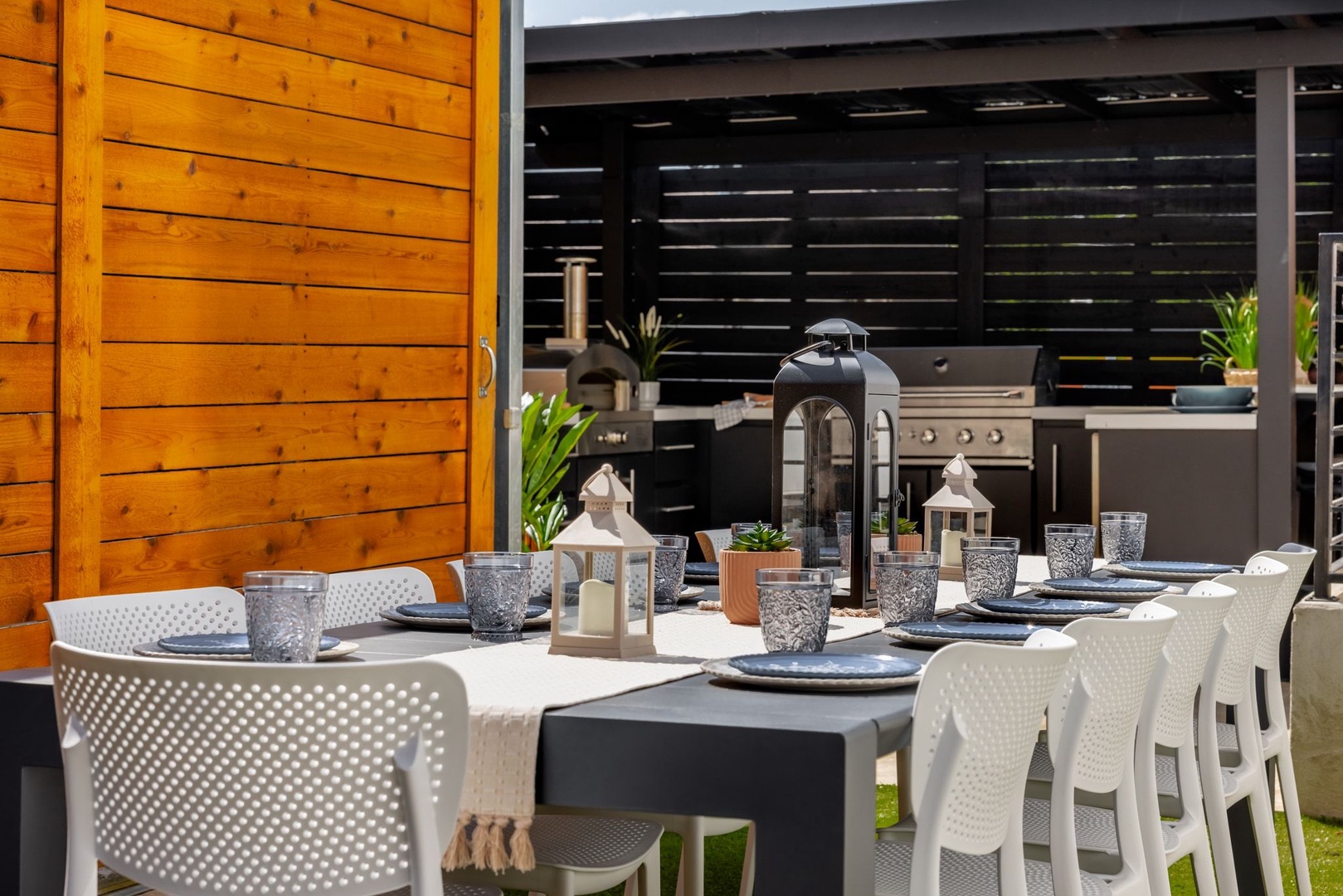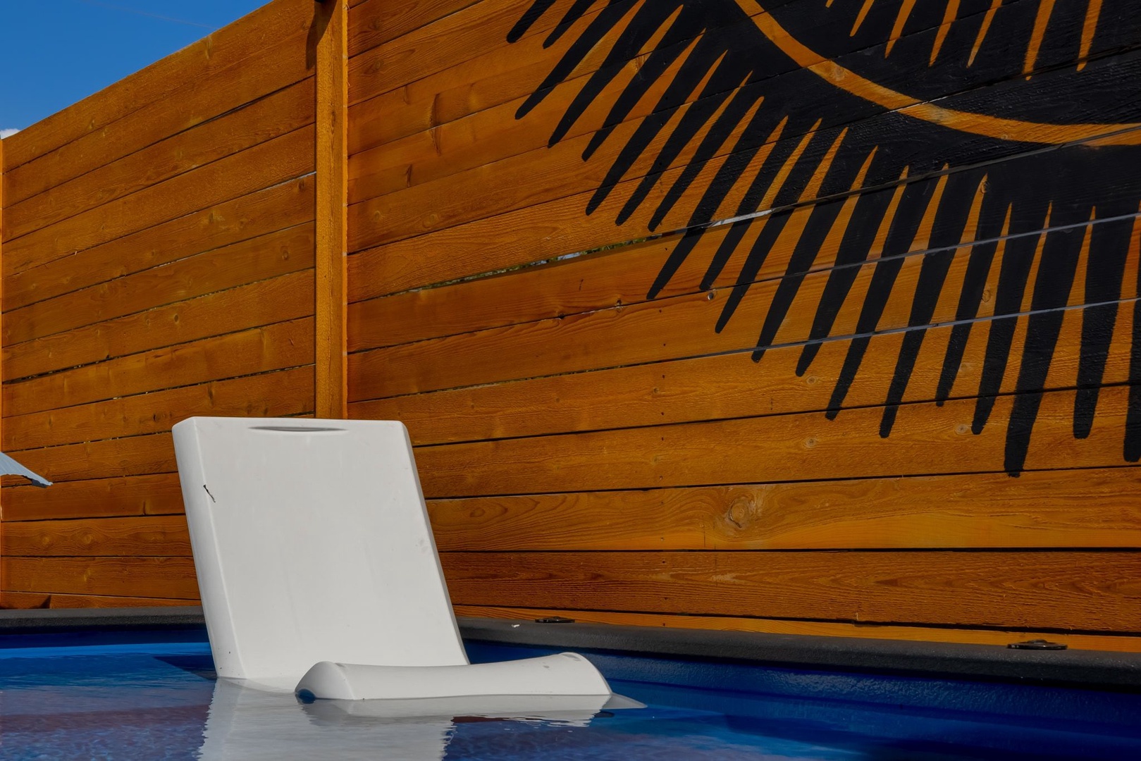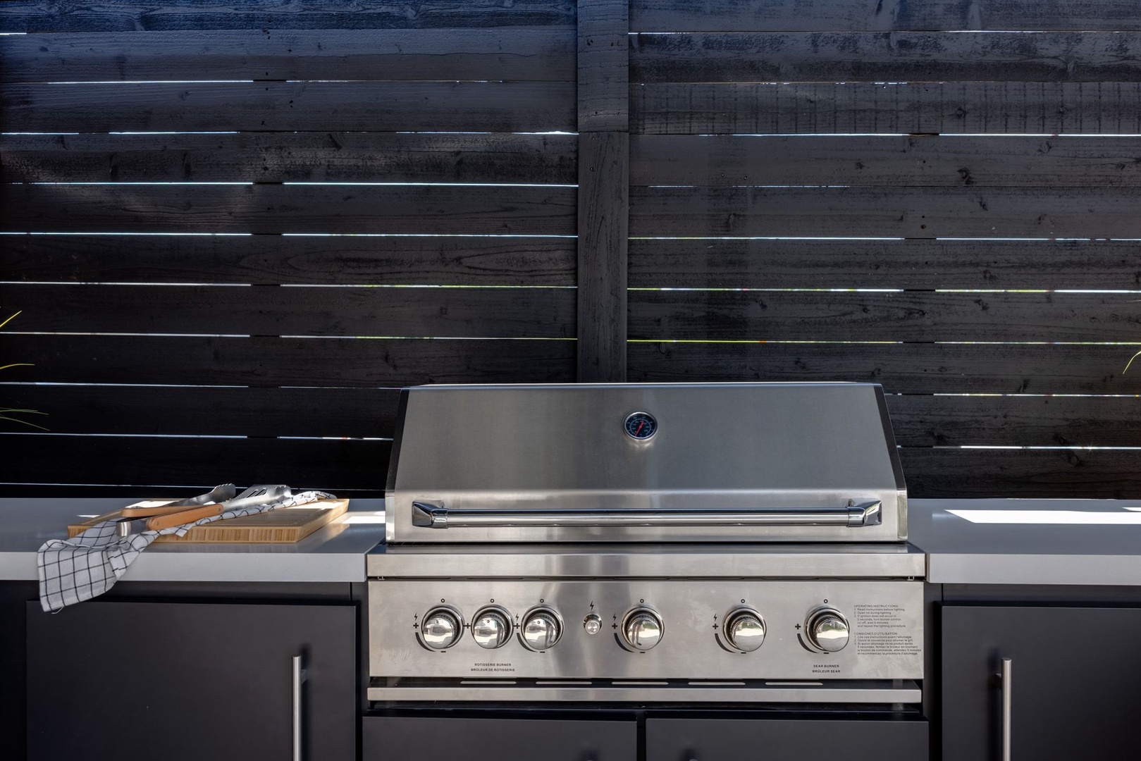 ? Out of this world amenities: One of a kind container pool. Two 6 person jacuzzis / hottubs. 2x Outdoor kitchens including 2x gas grills, 2x mini fridges, sink, gas pizza oven, tons of counter / prep space and bar seating. Outdoor dining and several sitting/lounging areas with tons of awesome night time mood lighting.