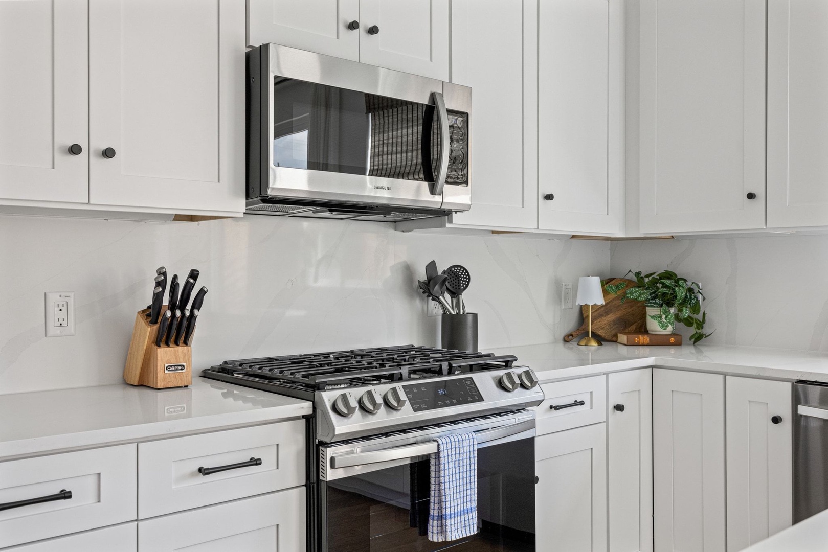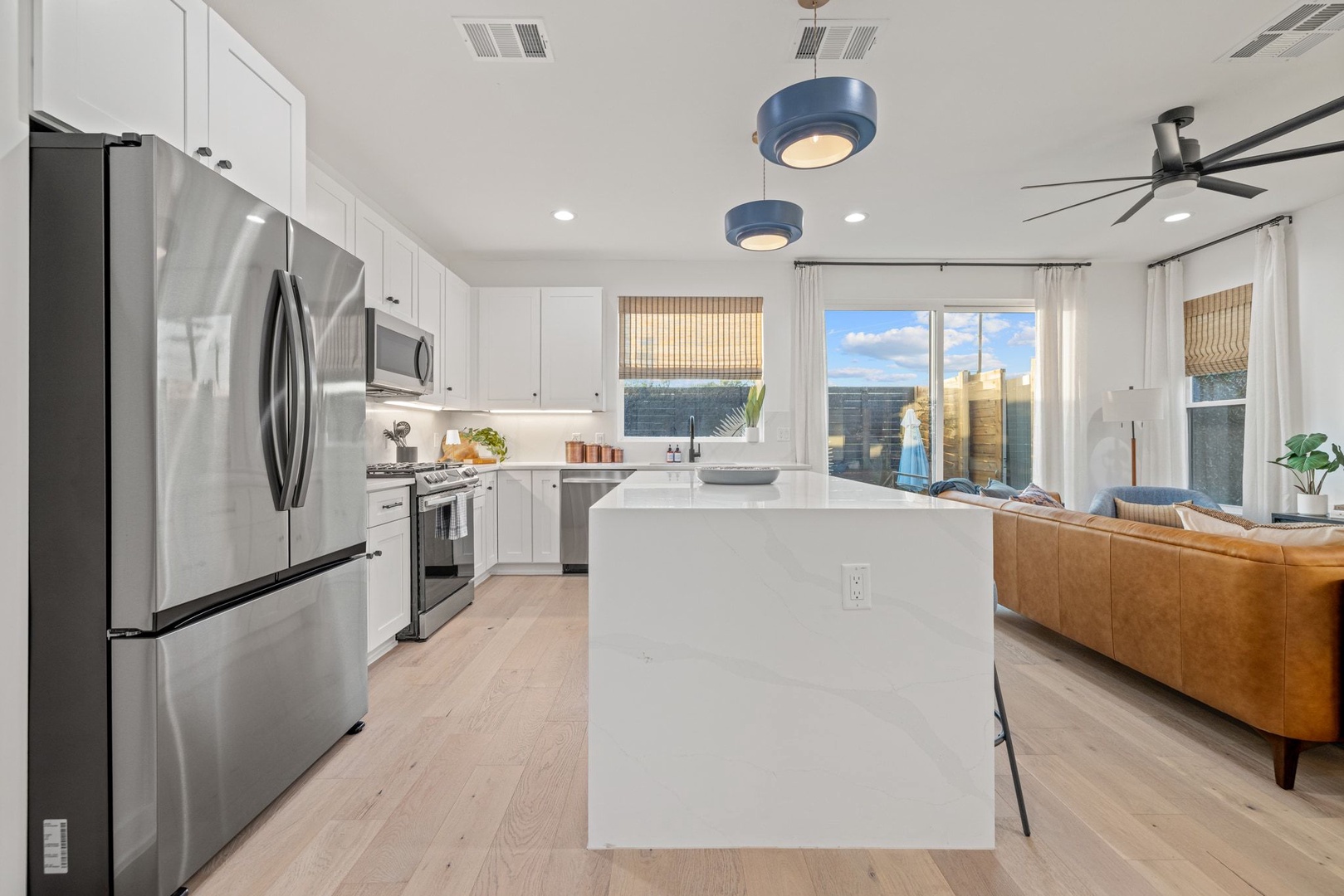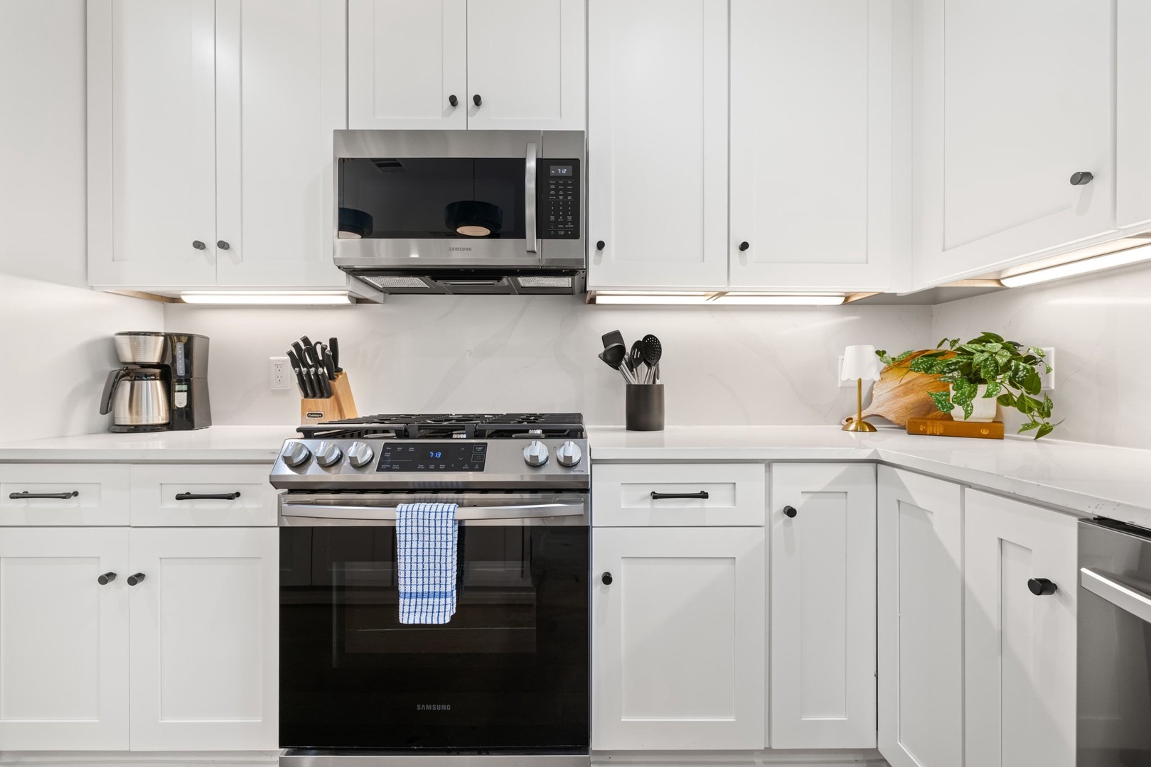 The open-concept kitchens open up into comfortable living areas, making it easy to hang out as a group whether you’re the one doing the cooking or the one awaiting a meal. You can sit back and relax on the comfy sofa, stream your favorite shows and movies on the flat-screen smart TV, or get a game of cards going with your friends.