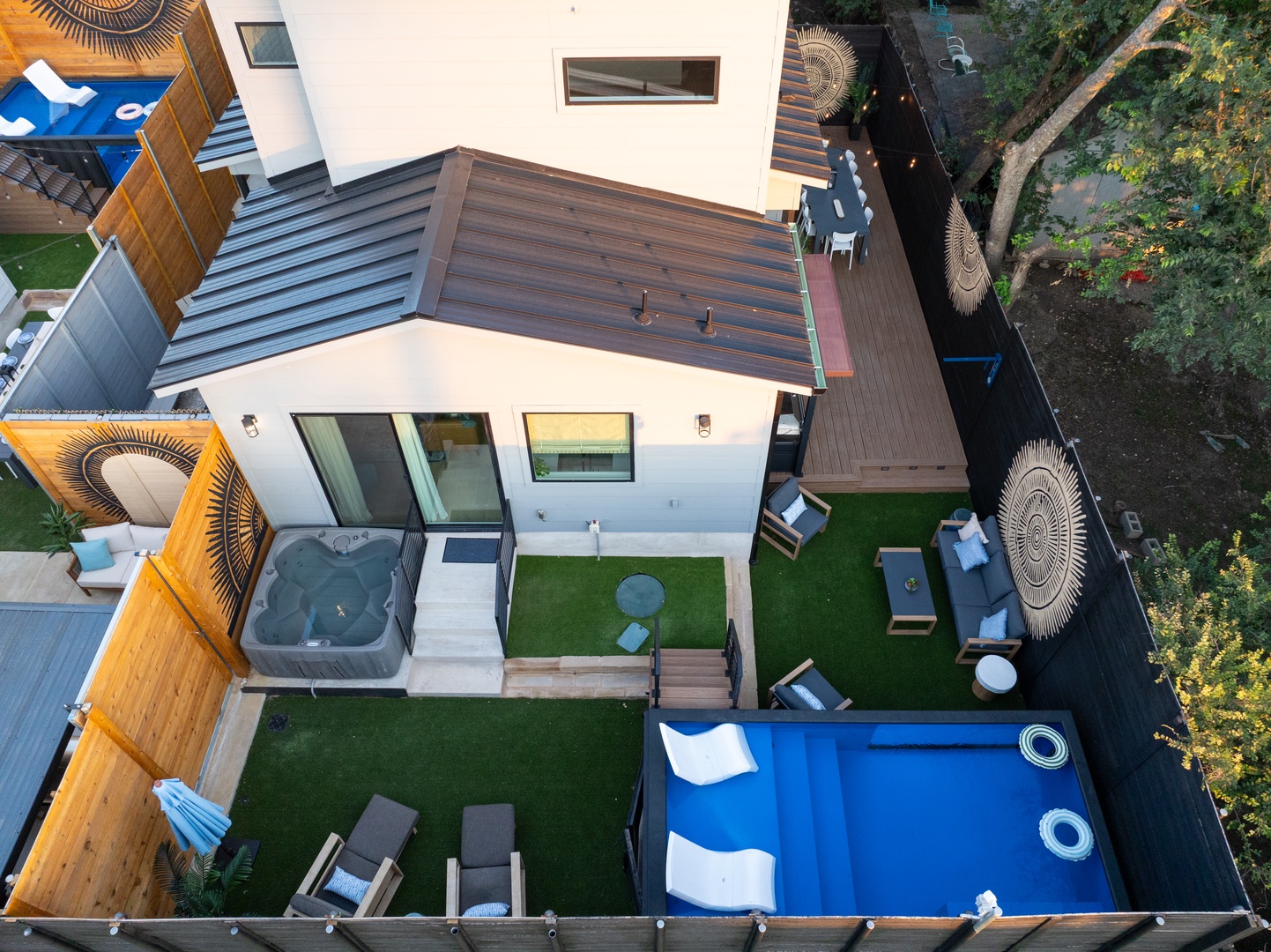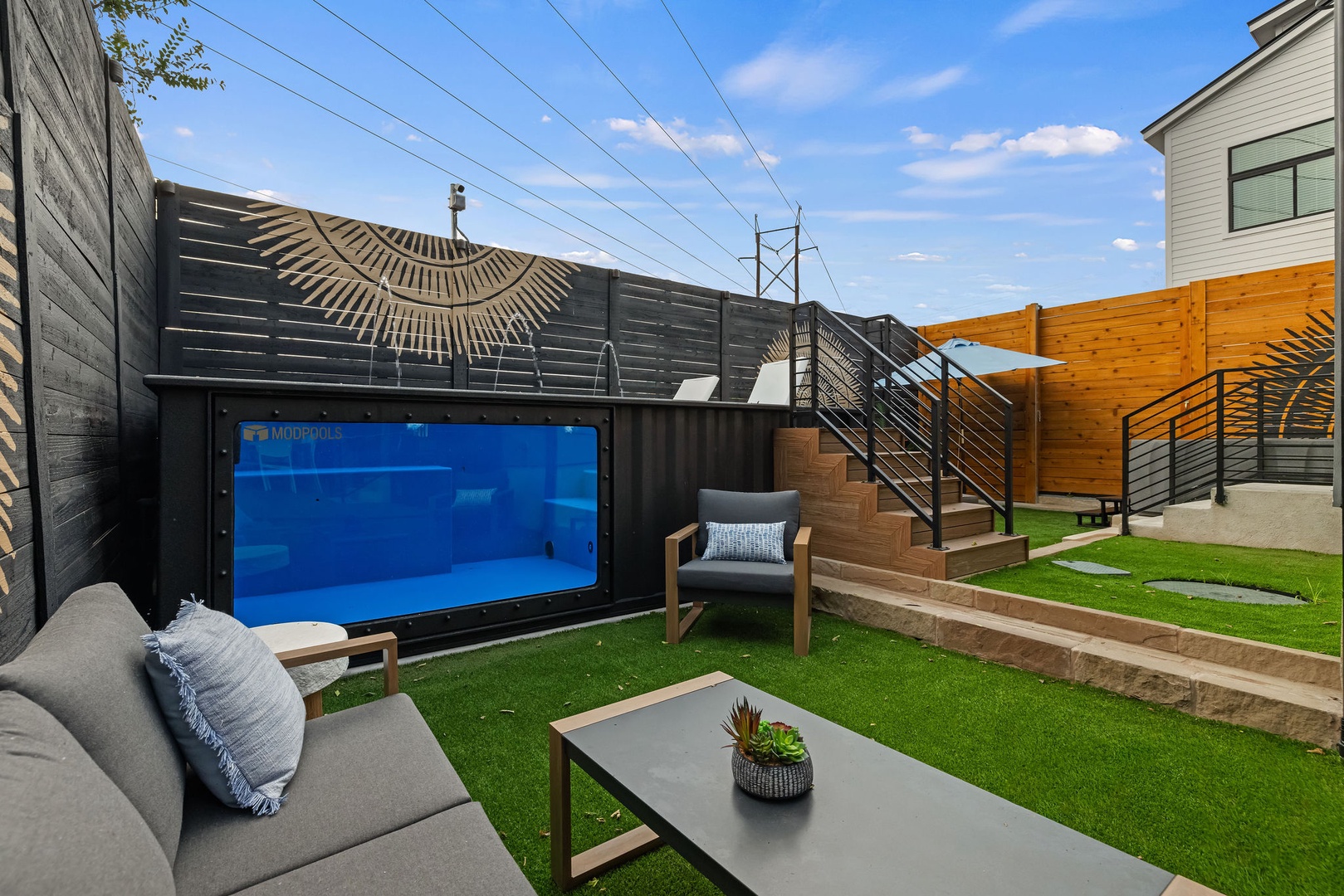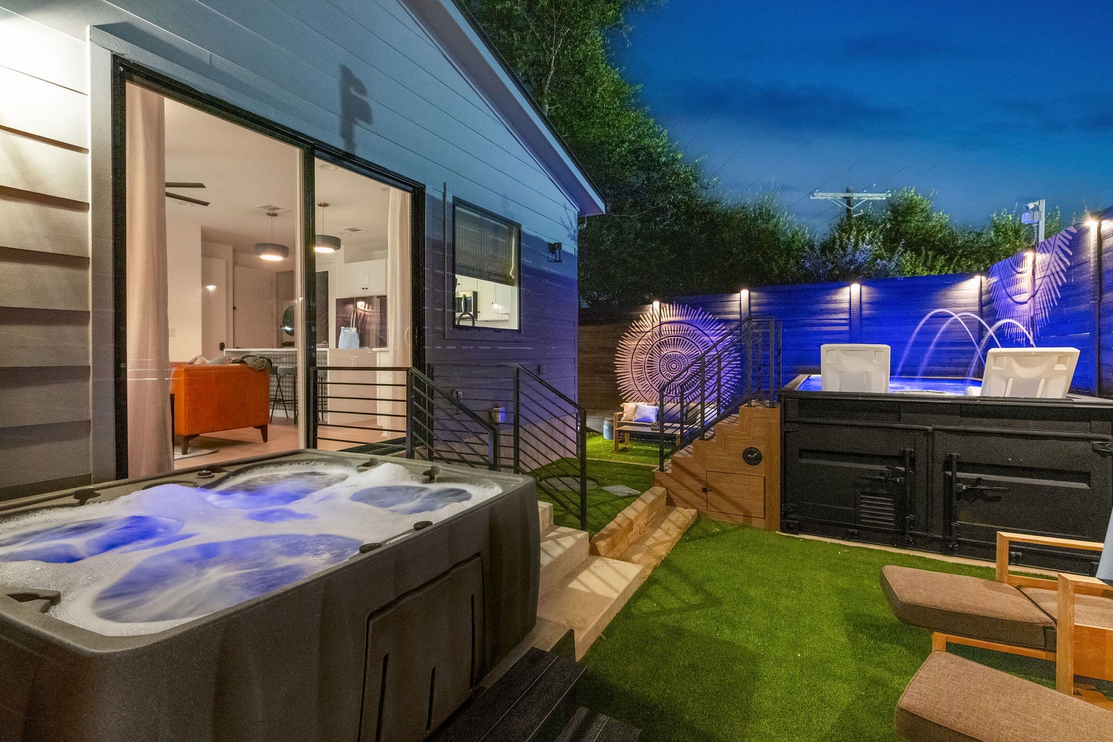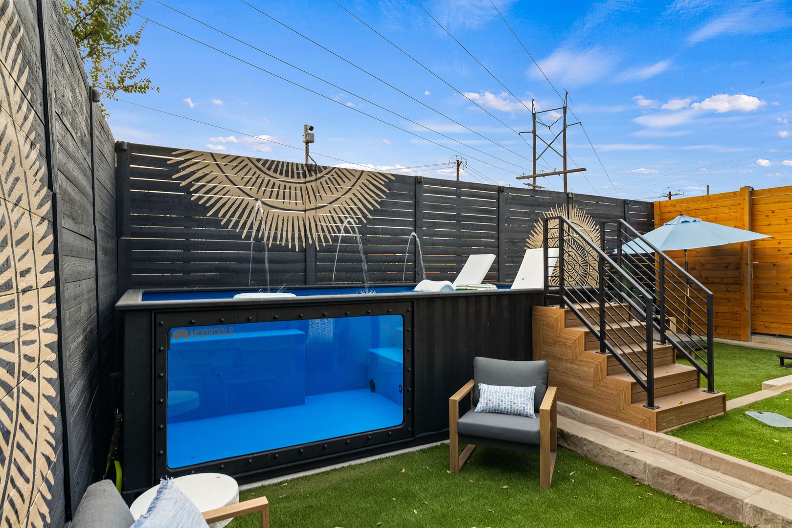 ? Out of this world amenities: One of a kind container pool. 6 person jacuzzi / hottub. Outdoor kitchen which includes grill, mini fridge and prep counter space. Outdoor dining and several sitting/lounging areas with tons of awesome night time mood lighting.